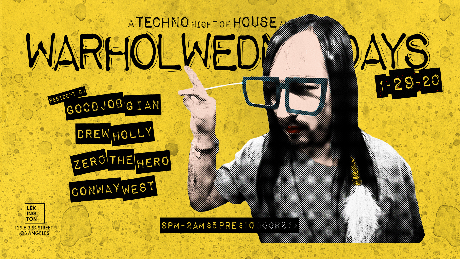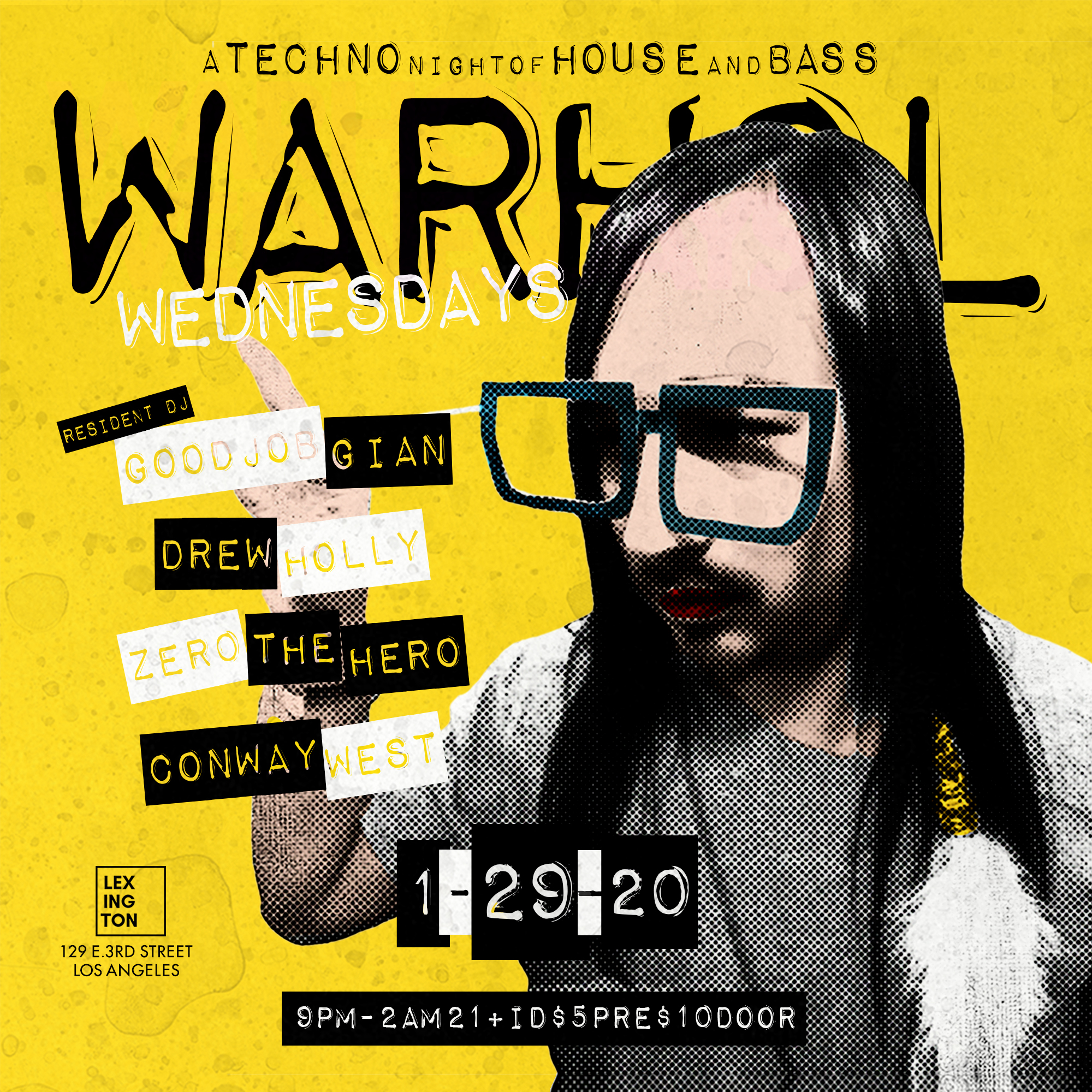 Facebook and Instagram flyer/promo artwork for Warhol Wednesdays weekly club. 2-5-20 w/resident DJ GoodJob Gian. Features: Original pop art style illustration from a promo photo.